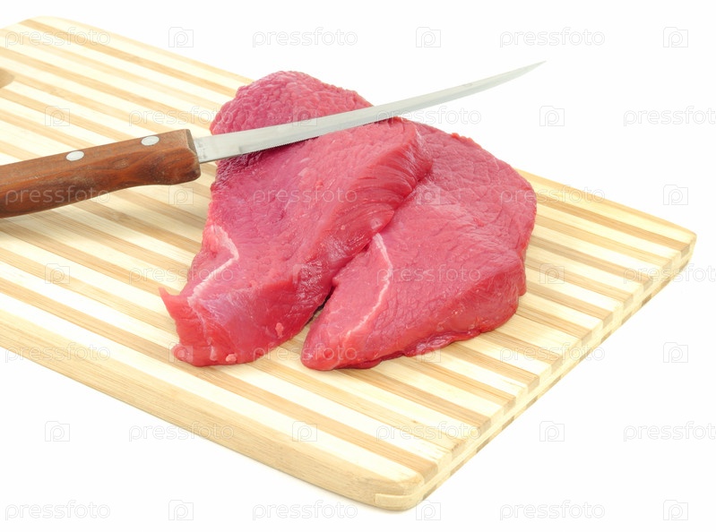 Свежий сырой бифштекс и нож на деревянной доске