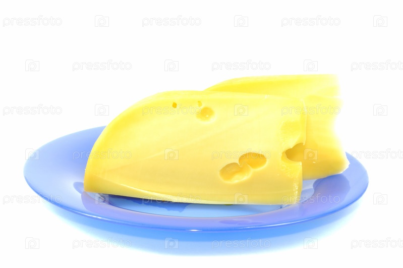 Свежий сыр на голубой тарелке, изолированный на белом фоне