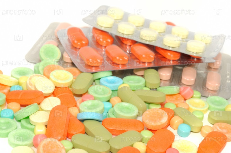 Разноцветные таблетки на белом фоне