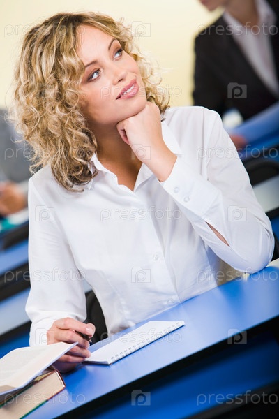 Портрет вдумчивой бизнес-леди, которая кладет подбородок на кулак