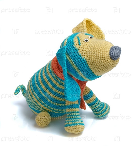 Игрушечная вязаная собака, изолированная, на белом фоне