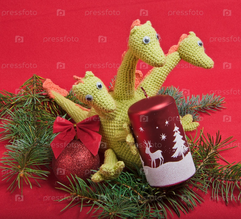 Игрушки как вязаные дракон с рождественской свечой на красном фоне