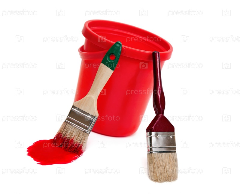 Две кисти и красное ведро на белом фоне