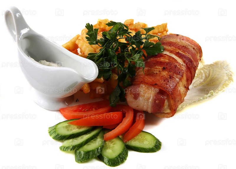 Котлета с беконом, картошка фри и свежие овощи на белом фоне