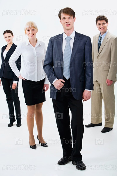Портрет красивого бизнесмена-лидера со своей рабочей командой