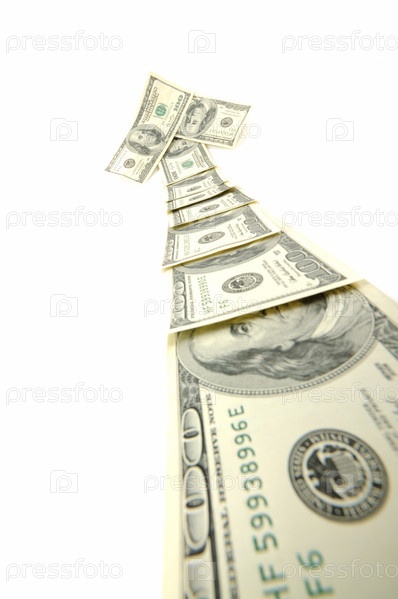 Растущая стрелка из американских долларов, белый фон