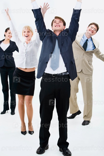 Счастливая бизнес-команда стоит и поднимает руки вверх