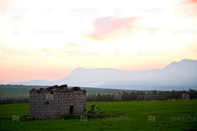 Восход солнца и старый кирпичный домик