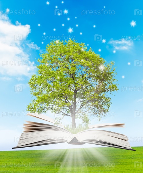 Волшебная книга с зеленым деревом и лучи света на фоне природы. Символ знаний