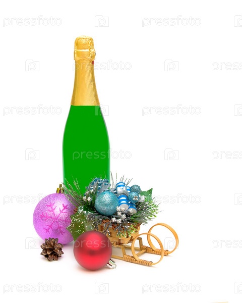 Рождественские украшения и бутылка шампанского на белом фоне