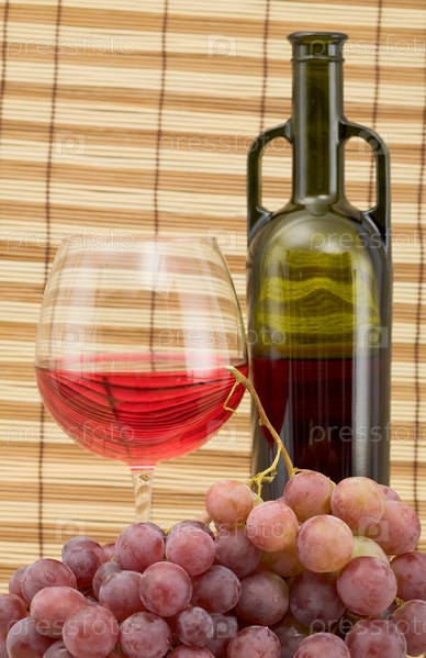 Бутылка, чаша и виноград на деревянном коврике из стекла