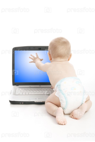 Ребенок использует ноутбук над белым