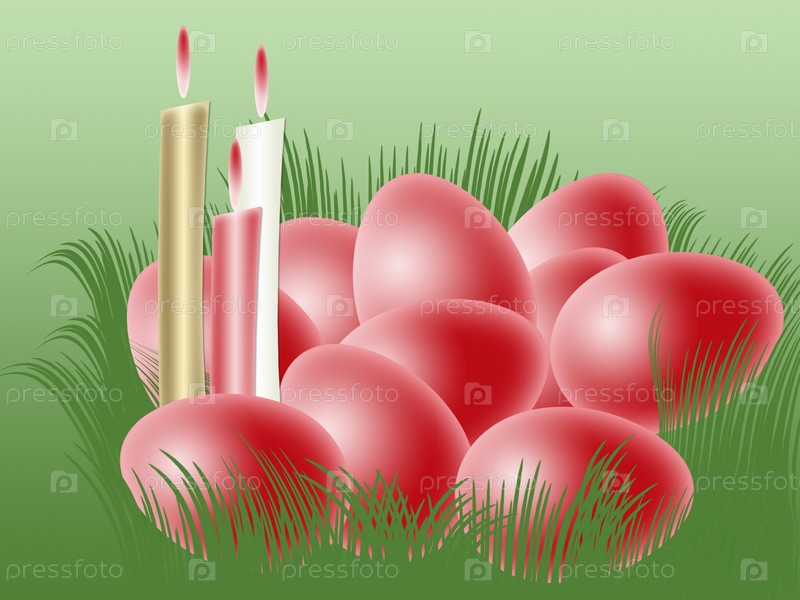 Пасхальные яйца и свечи в траве на зеленом фоне