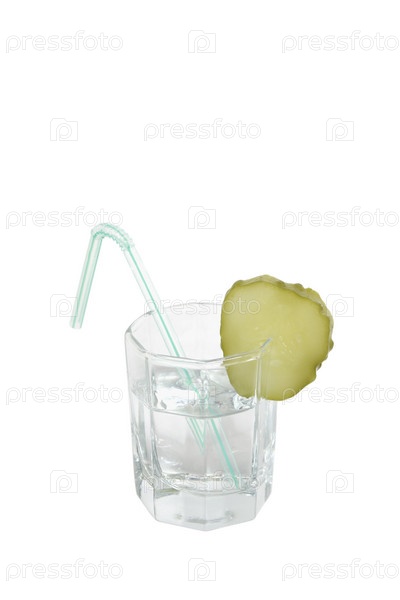 Стеклянный бокал с вином и водкой, а на изолированном белом фоне - кольцо огурца