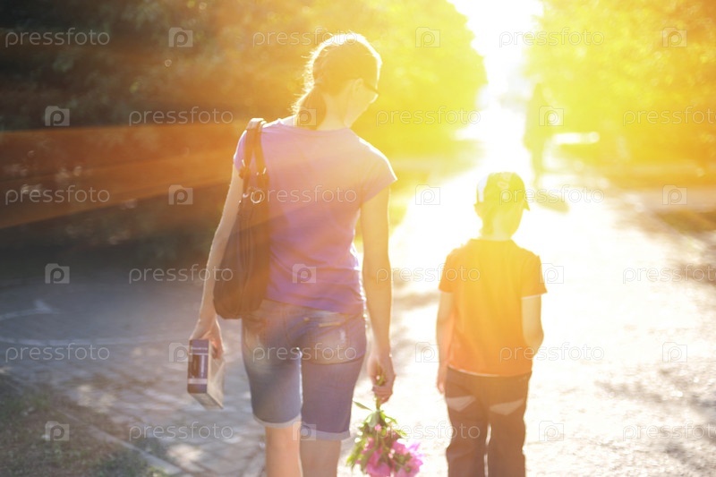 Женщина идет с сыном в лучах солнца