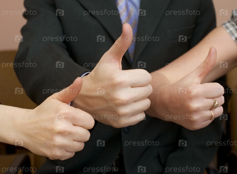 Команда веселых бизнесменов показывает большой палец вверх