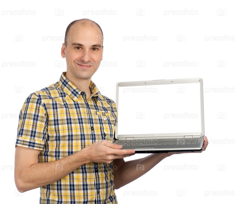 Мужчина с ноутбуком, изолированный на белом фоне