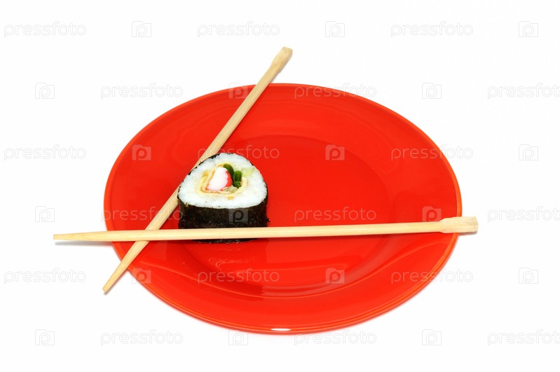 Традиционные японские суши на красной тарелке с палочками, изолированные на белом фоне