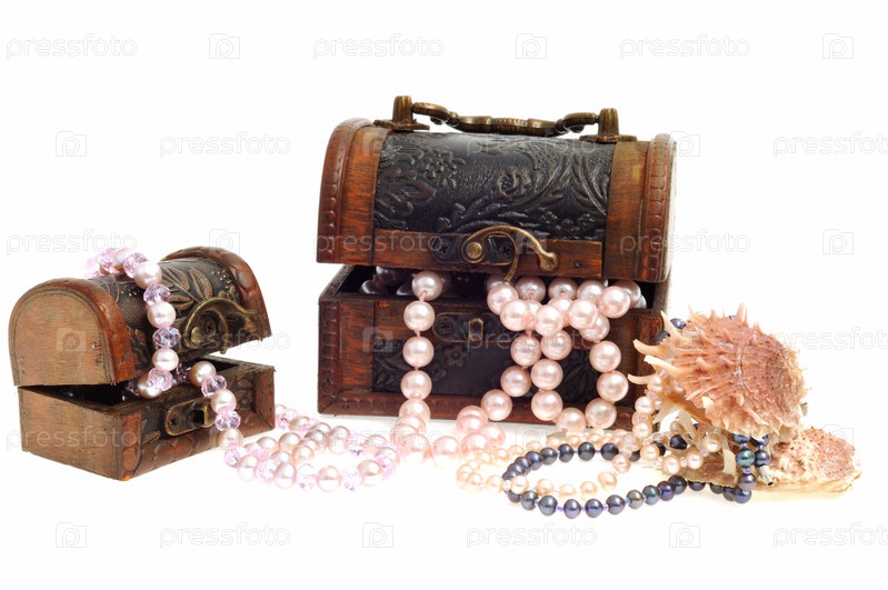 Две деревянные шкатулки с жемчужными ожерельями, на белом фоне