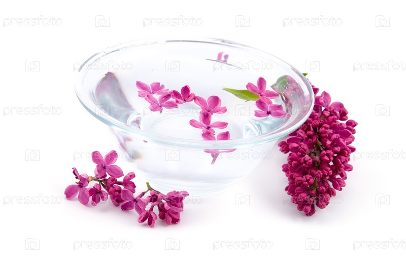 Ветка сирени и миска воды с лепестками на белом фоне. Ароматерапия