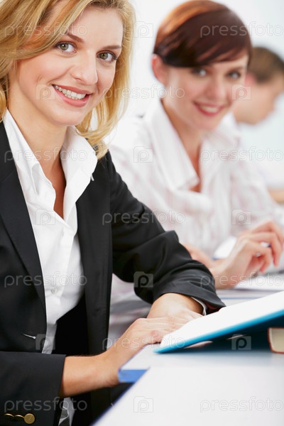 Уверенная в себе деловая женщина сидит за столом с книгами на нем