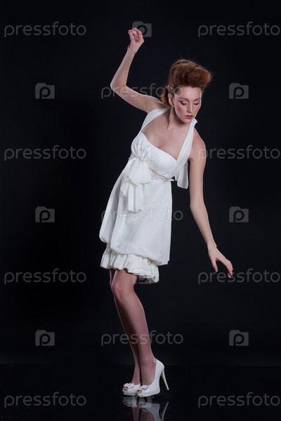 Молодая женщина в свадебном платье на черном фоне
