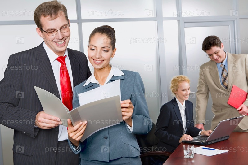 Деловая женщина показывает свой успешный бизнес-план коллеге в офисе на фоне двух деловых людей