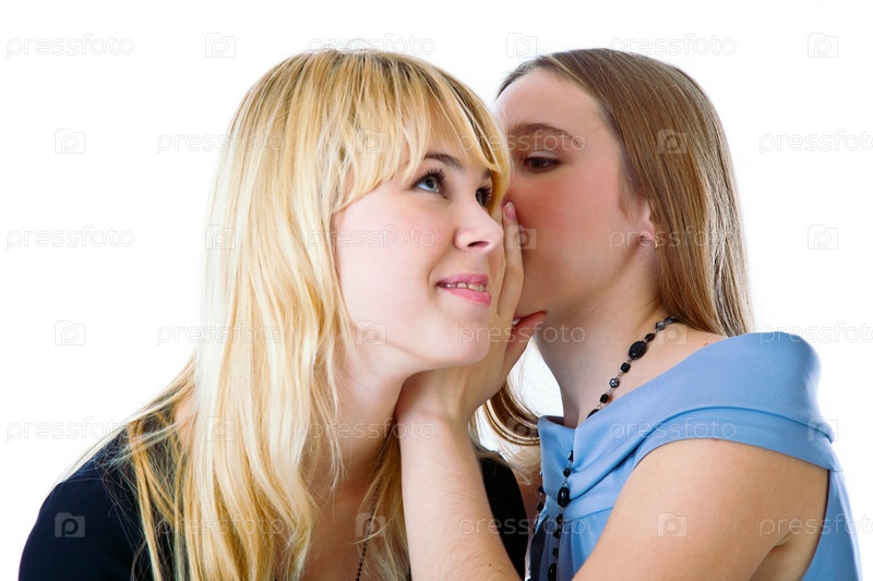 Две счастливые молодые подруги, рассказывающие секрет. изолированы на белом фоне