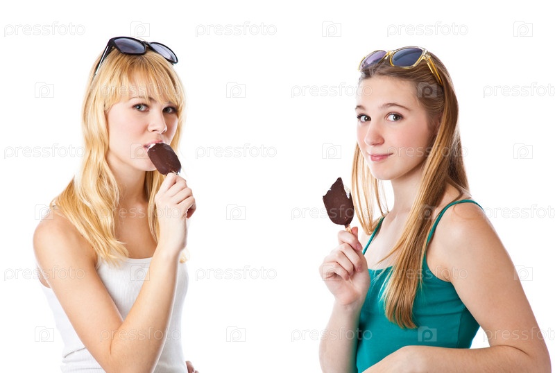 Две девочки-подростки едят мороженое, изолированные на белом фоне