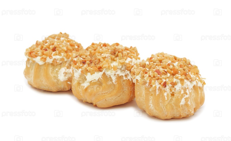 Пирожное с кремом и ореховой крошкой, изолировано на белом фоне