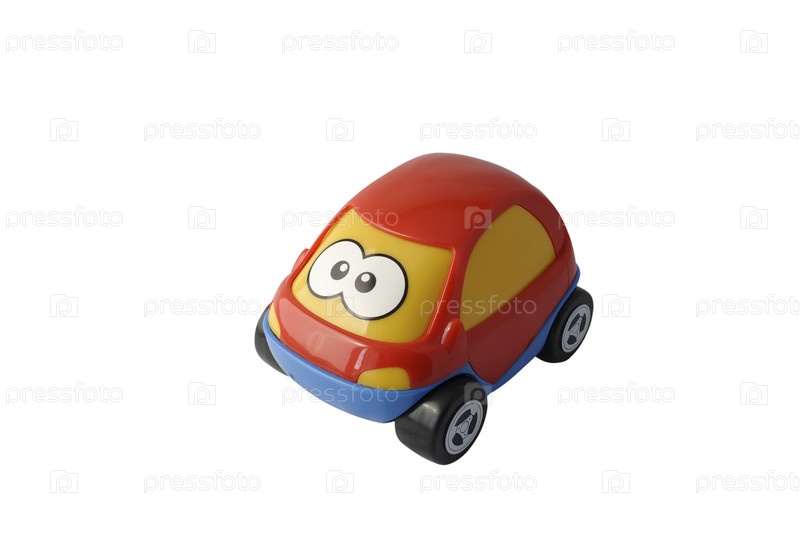 Игрушка, многоцветная машина из пластика, расположена на изолированном белом фоне