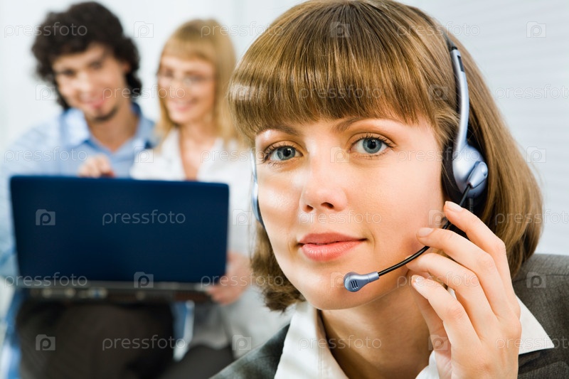 Дружелюбный телефонный оператор держит гарнитуру на фоне двух коллег по работе
