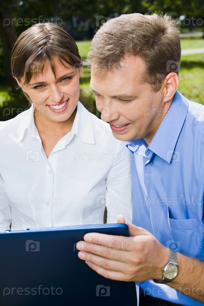 Уверенный менеджер демонстрирует проект на ноутбуке своему бизнес-партнеру снаружи