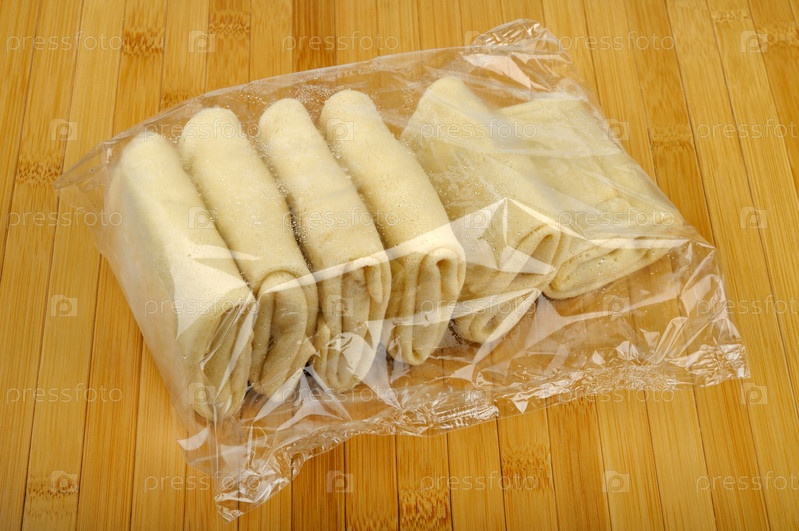 Пакет замороженных блинчиков на деревянном столе