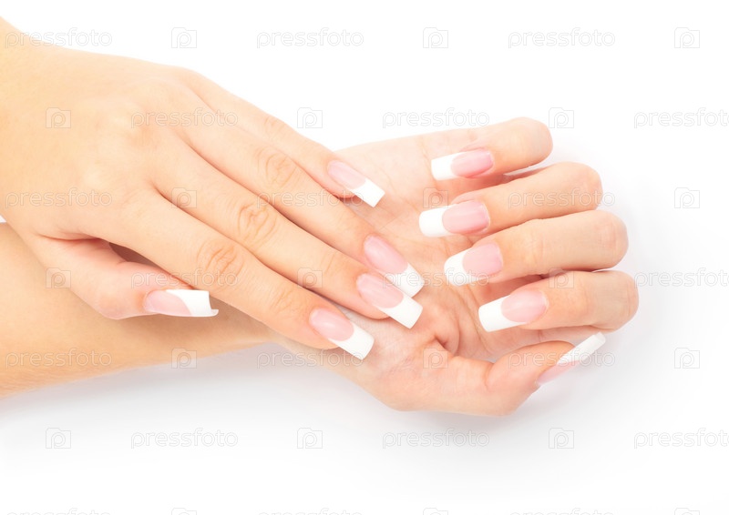 Женские руки с французским маникюром на белом фоне