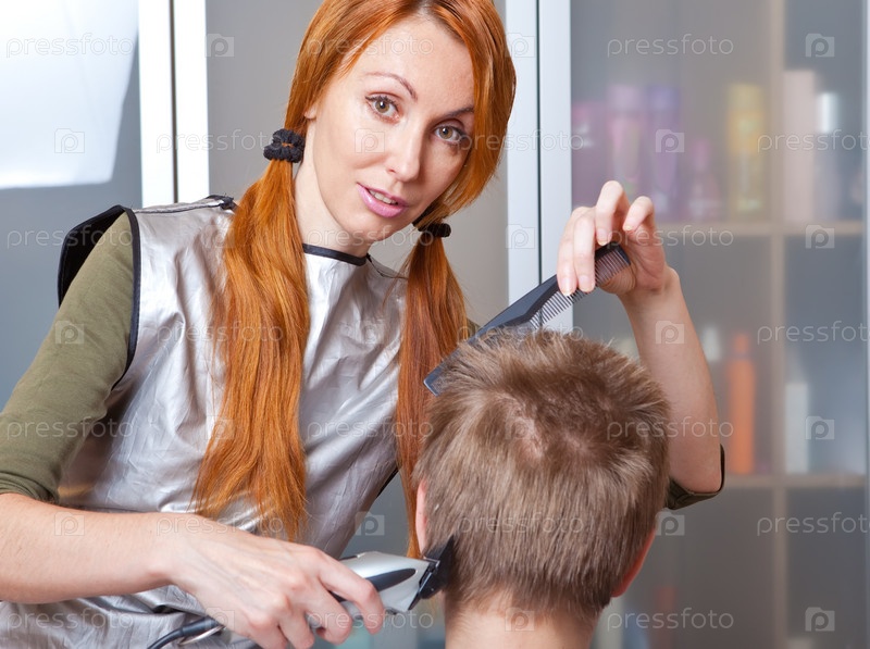 Красивая молодая женщина-парикмахер делает прическу клиенту