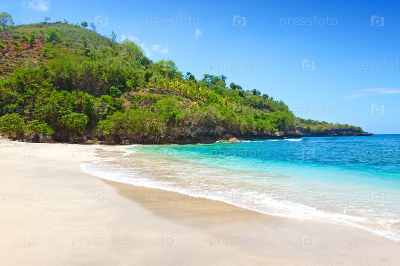 Вид с пляжа на скалы в океане. Индонезия, Бали
