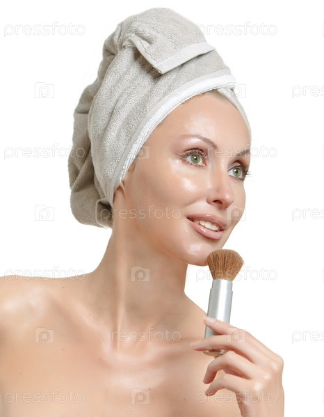Красивая молодая женщина с полотенцем на голове и кистью для макияжа