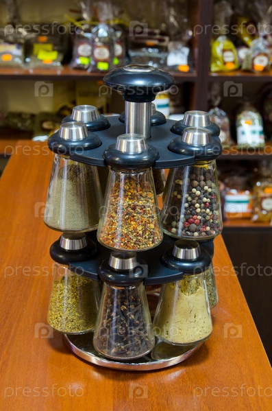 Различные специи в стеклянных баночках