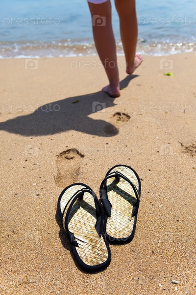 Пляжные тапочки на песке, и девушка на пляже. Фокус на тапочках