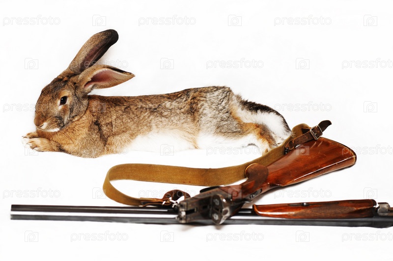 Серый заяц и ружье на переднем плане. Изолированные на белом фоне