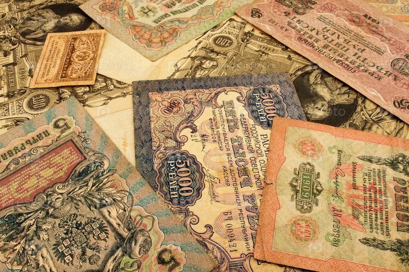 Старые российские денежные банкноты крупный план, фон