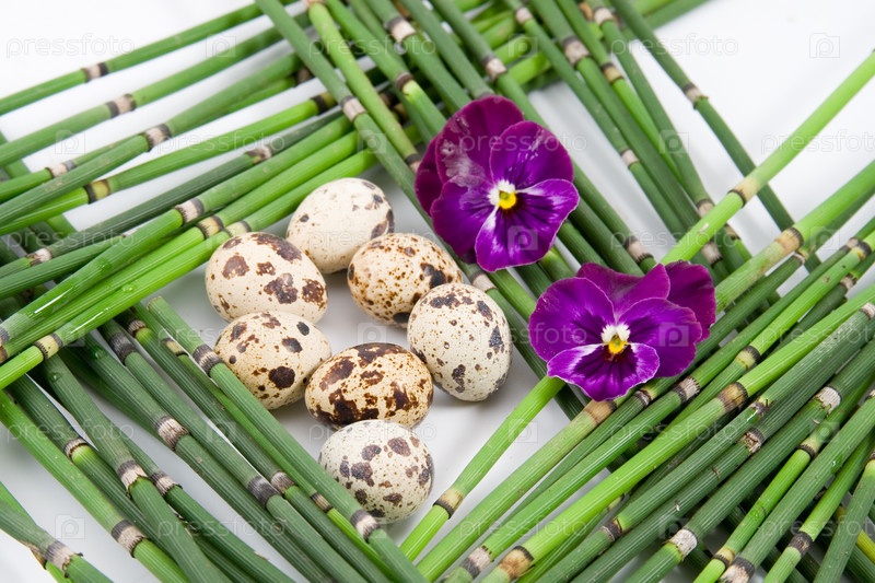 Перепелиные яйца в стилизованном гнезде из зеленых стеблей