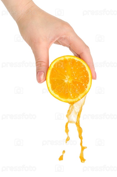 Сочный апельсин в руке, изолировано на белом фоне