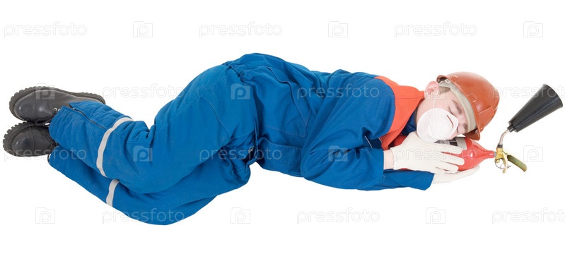 Мужчина в комбинезонах спит на огнетушителе