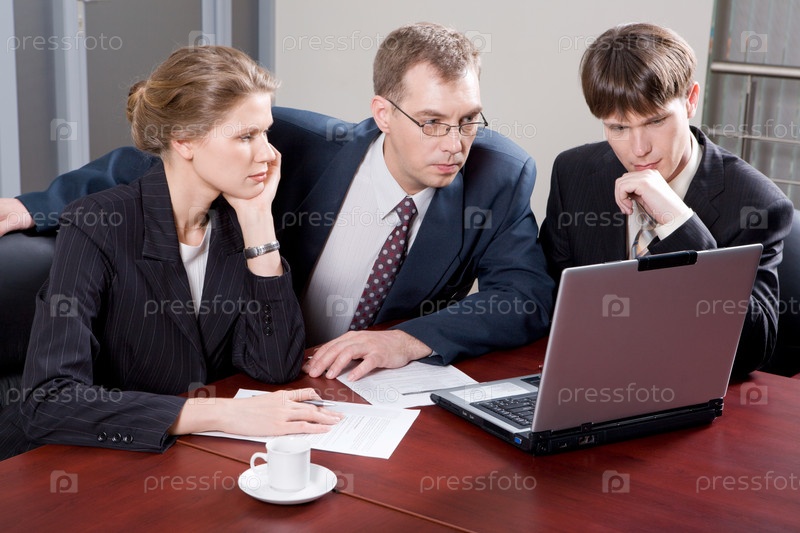 Деловая команда из трех профессионалов смотрит на монитор ноутбука в офисе