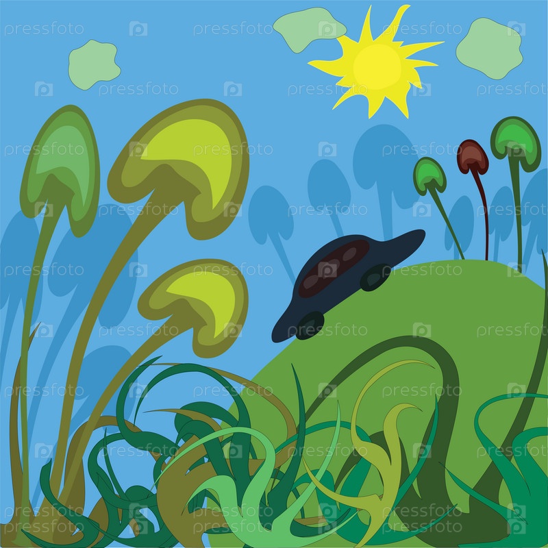 Летний пейзаж с машиной. Векторная иллюстрация