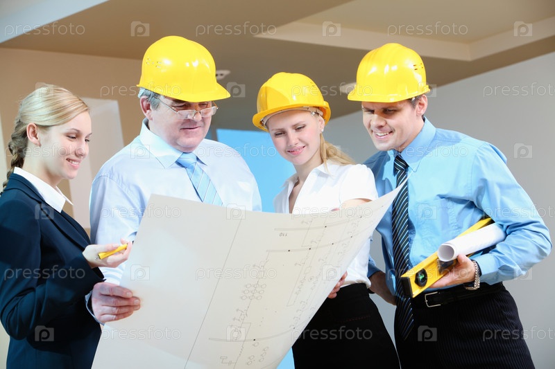 Рабочие обсуждают схему строительства