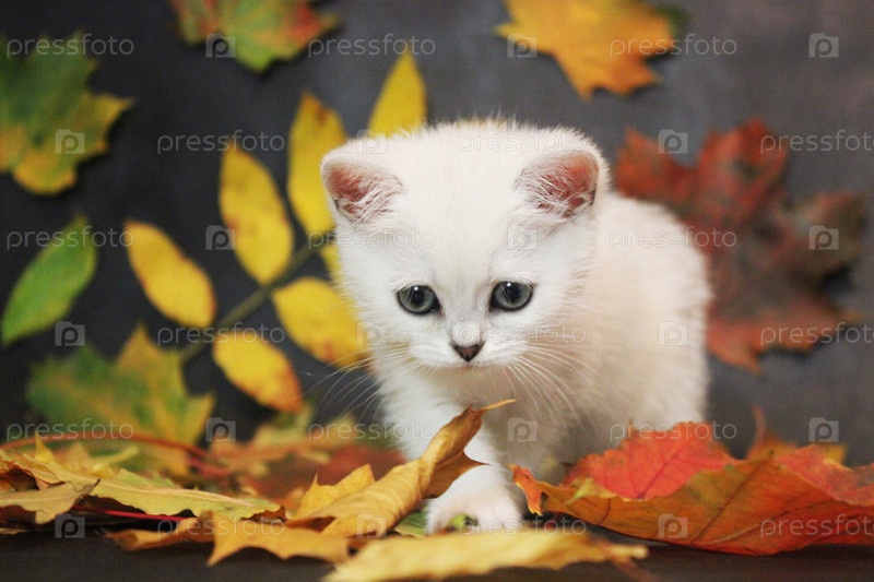 Белый котенок среди листьев