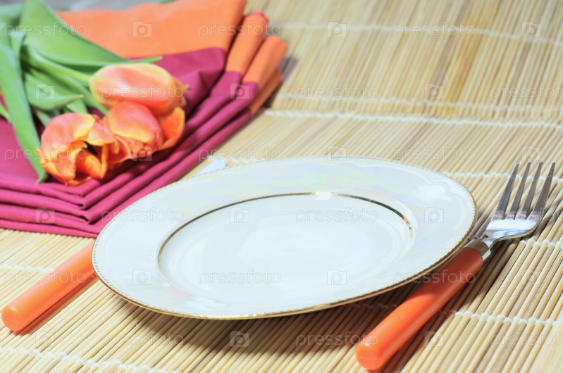 Тарелка с приборами и тюльпаны на столе